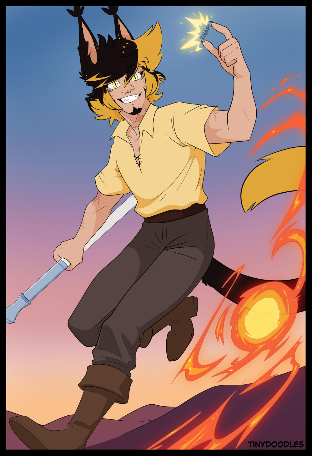 Snapping his fingers, sneezing, even coughing might produce a bit of ember or smoke. He's working on this... issue. His affinity makes him warm to the touch, and is lovingly referred to as a "walking furnace."High WIS, low INT: